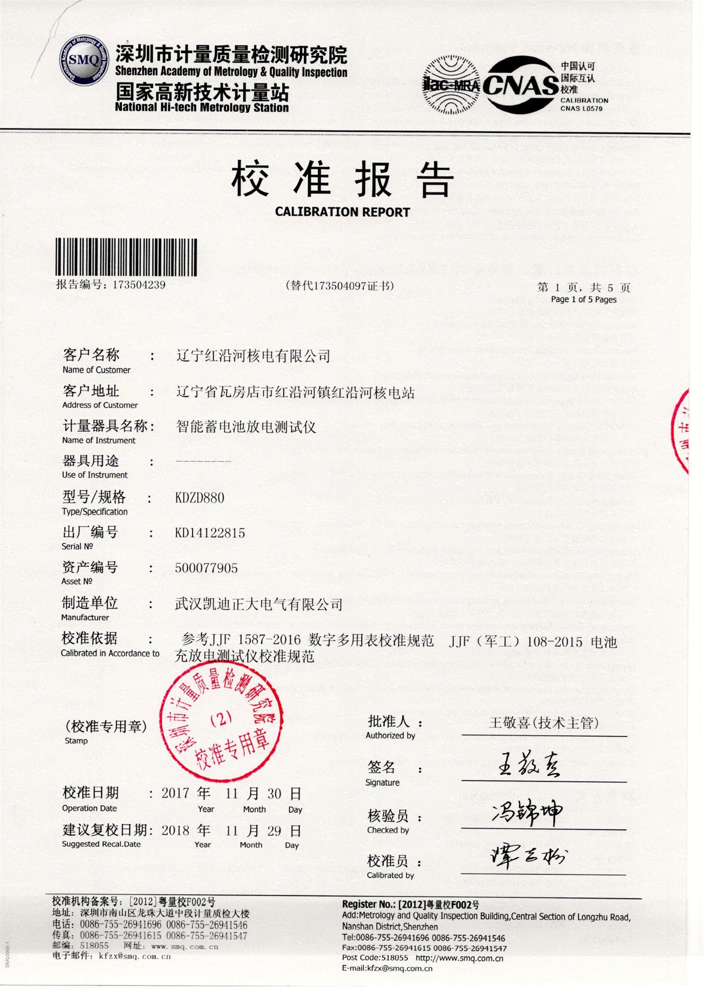 ![]() 湖北省計量測試技術研究院校準證書 |