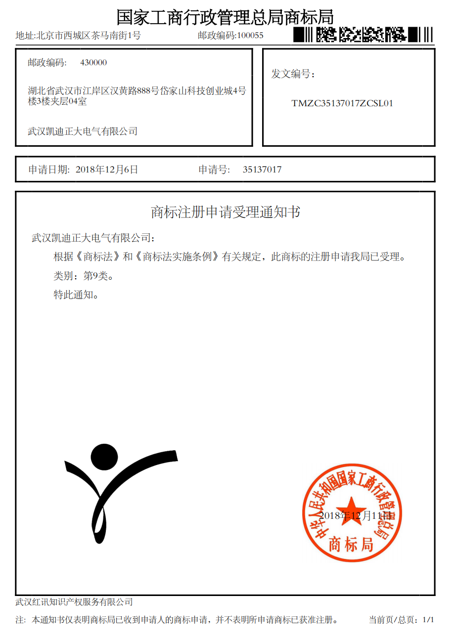 ![]() “凱迪正大”國家工商行政總局商標局受理書 |