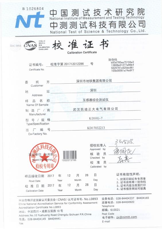 ![]() 中國測試技術研究院-KDHG互感器儀校準證書 |