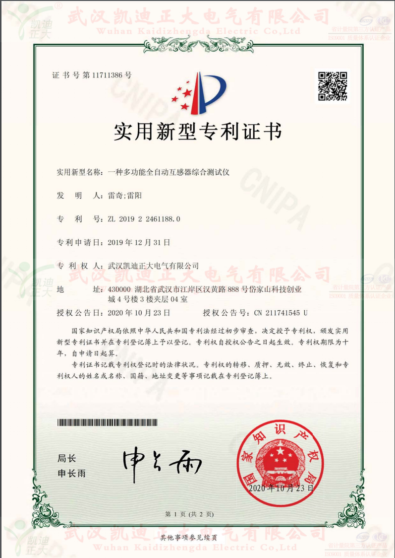 2、一種多功能自動互感器綜合測試儀。證書號第11711386號,專利號:ZL 2019 2 2461188.0,發明人:雷奇;雷陽,專利權人:武漢凱迪正大電氣有限公司,授權公告號:CN 211741545 U。