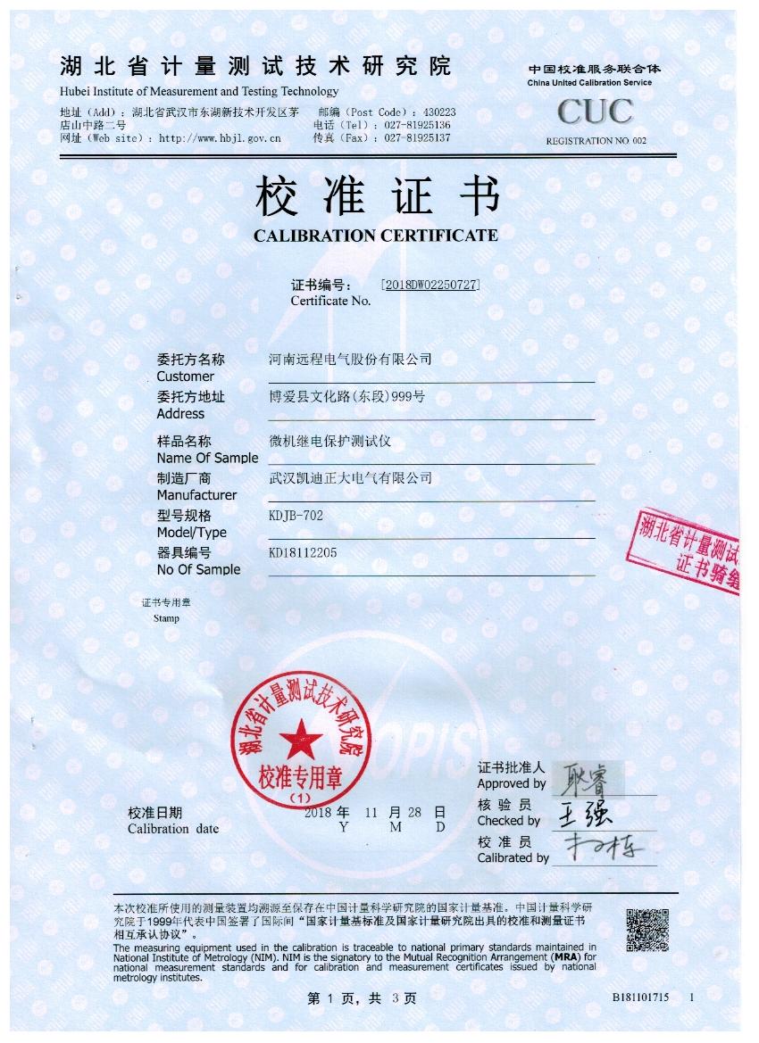 湖北省計(jì)量測試技術(shù)研究院是政府計(jì)量行政管理部門依法設(shè)立的法定計(jì)量檢定機(jī)構(gòu),本次校準(zhǔn)的技術(shù)依據(jù)是參照J(rèn)JG 1112-2015繼電保護(hù)測試儀,校準(zhǔn)所使用的主要計(jì)量設(shè)備數(shù)字多用表,型號(hào)/編碼:8508A,校準(zhǔn)環(huán)境溫度20.2度,相對(duì)濕度40度,校準(zhǔn)數(shù)據(jù)結(jié)果符合國家電力預(yù)試設(shè)備標(biāo)準(zhǔn)。