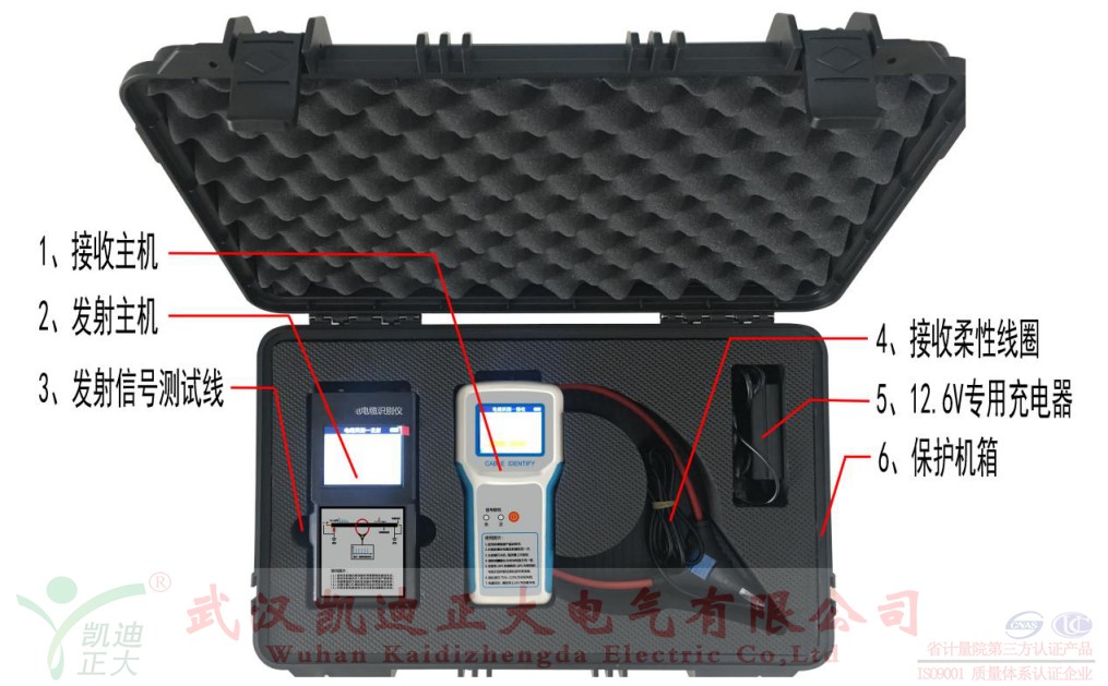 KD-214A帶電電纜識別儀(以下簡稱識別儀)是用于將某一特定電纜從一束電纜中識別出來的專用儀器。它即能識別停電電纜,也能識別帶電電纜,滿足了電力施工現(xiàn)場對電纜識別的多重需求。識別儀主要由發(fā)射主機、接收主機、發(fā)射連線、發(fā)射卡鉗與柔性測量線圈構成。識別儀的設計相比上一代產(chǎn)品更加緊湊小巧,攜帶方便,具有如下特點:
