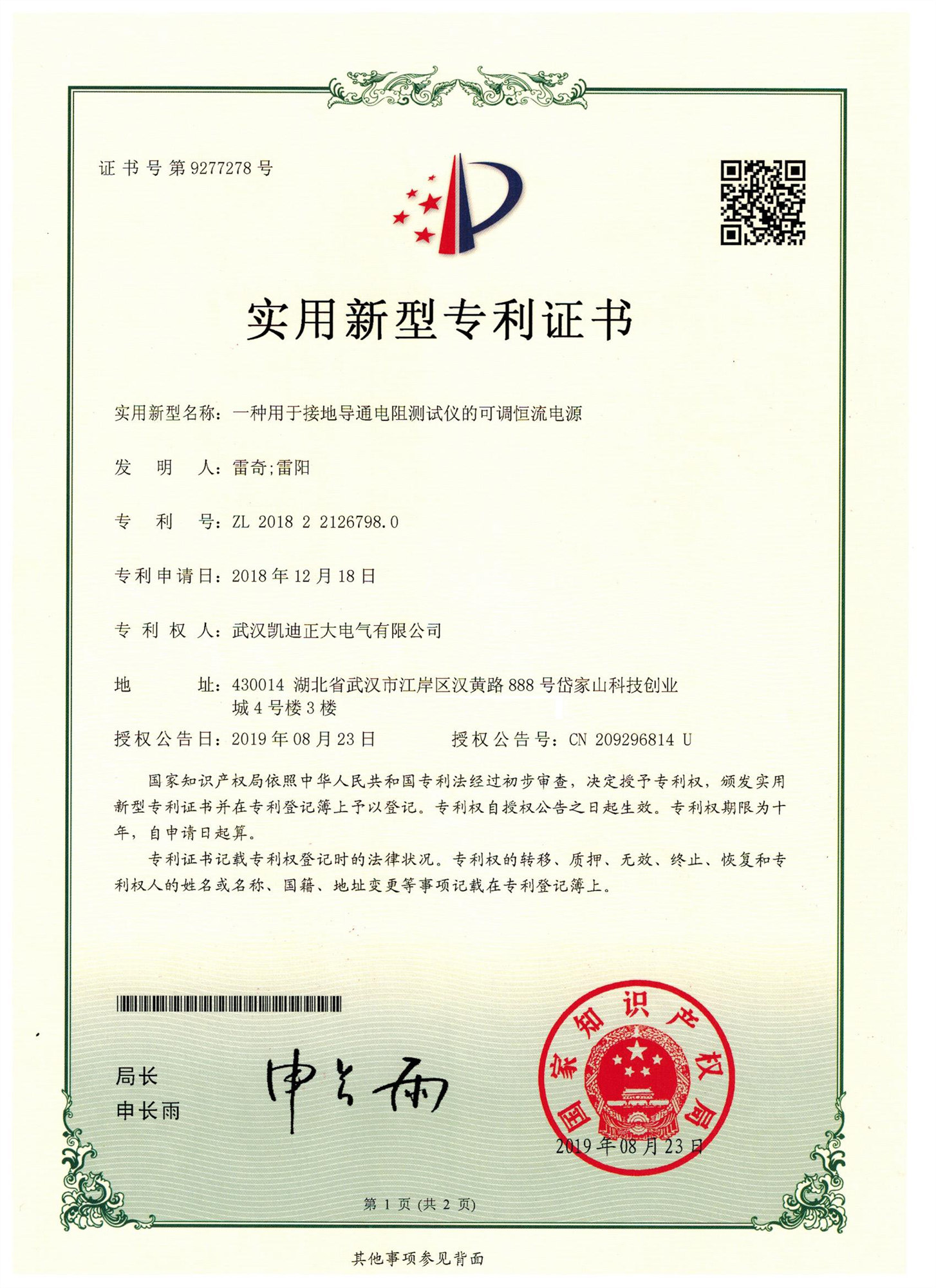 KDDT-10A接地引下線導(dǎo)通測試儀專利,一種用于接地導(dǎo)通電阻測試儀的可調(diào)恒流電源,證書號第:9277278號。專利號:ZL 2018 2 2126798.0 專利權(quán)人:武漢凱迪正大電氣有限公司