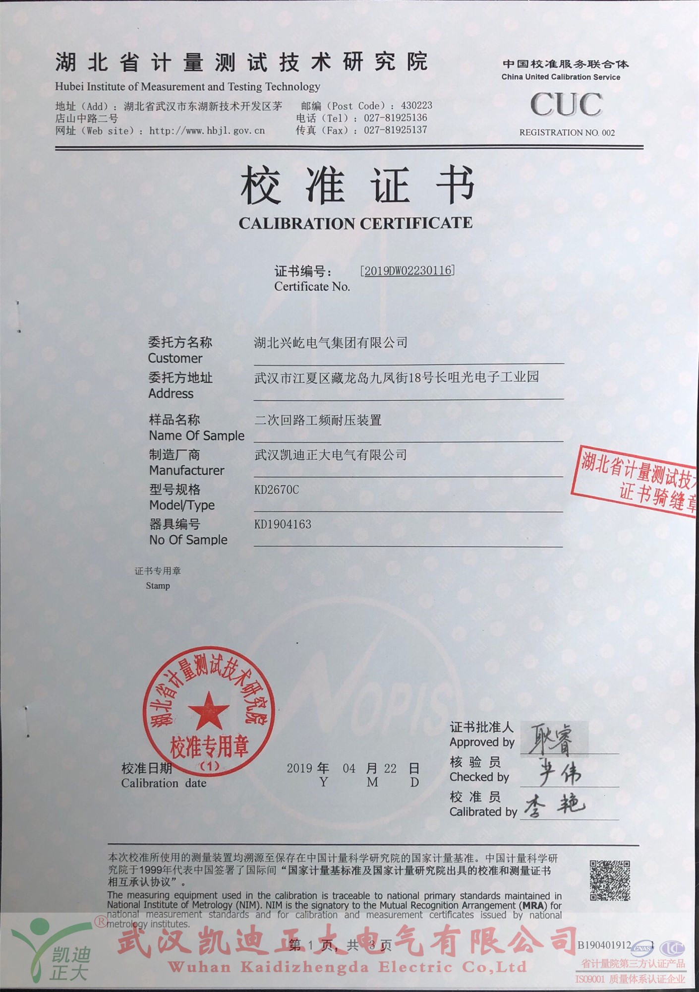 購買后便送往中國校準(zhǔn)服務(wù)聯(lián)合體-湖北省計(jì)量測試技術(shù)研究院檢定,由省計(jì)量院出具的《校準(zhǔn)證書》,證書編號(hào):2019DW02230116,校準(zhǔn)員:李艷,檢驗(yàn)員:嚴(yán)偉,證書批準(zhǔn)人:耿睿。