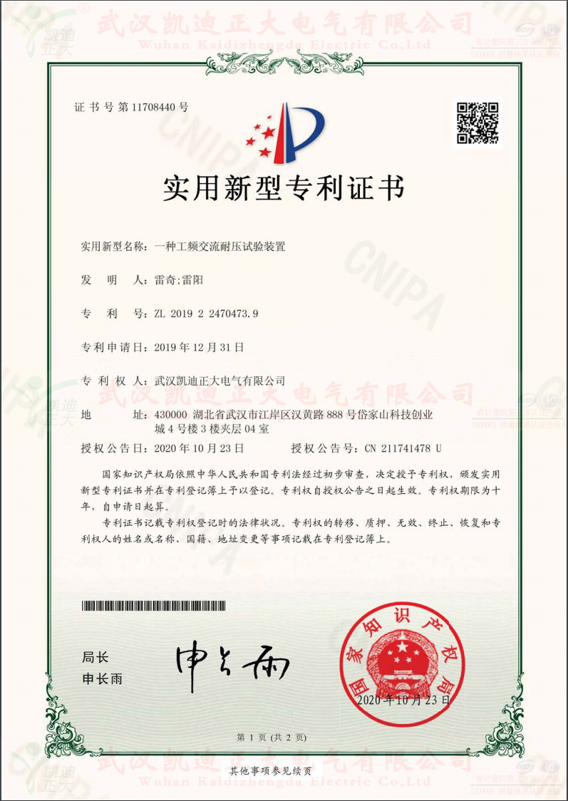 一種工頻交流耐壓試驗裝置。證書號第11708440號,專利號:ZL 2019 2 2470473.9,發(fā)明人:雷奇;雷陽,專利權(quán)人:武漢凱迪正大電氣有限公司,授權(quán)公告號:CN 211741478 U。