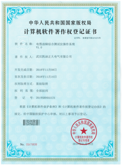 2019年,武漢凱迪正大電氣有限公司新力之作,榮獲中華人民共和國國家版權(quán)局《計算機軟件著作權(quán)登記證書》系統(tǒng)計算機軟件著作登記以及質(zhì)量管理體系認(rèn)證證書,其中包含電纜故障綜合測試儀操作系統(tǒng)V1.0(證書號:軟著登字第3475878號)、氧化鋅避雷器帶電測試儀操作系統(tǒng)V1.0(證書號:軟著登字第3478045號)、高壓開關(guān)動作特性測試儀操作系統(tǒng)V1.0(證書號:軟著登字第3478053號)、變頻串聯(lián)諧振耐壓試驗裝置操作系統(tǒng)V1.0(證書號:軟著登字第3475581號)、電纜震蕩波局放定位系統(tǒng)操作系統(tǒng)V1.0(證書號:軟著登字第3475874號)等證書共計5份。權(quán)利取得方式:原始取得。權(quán)利范圍:全部范圍。
