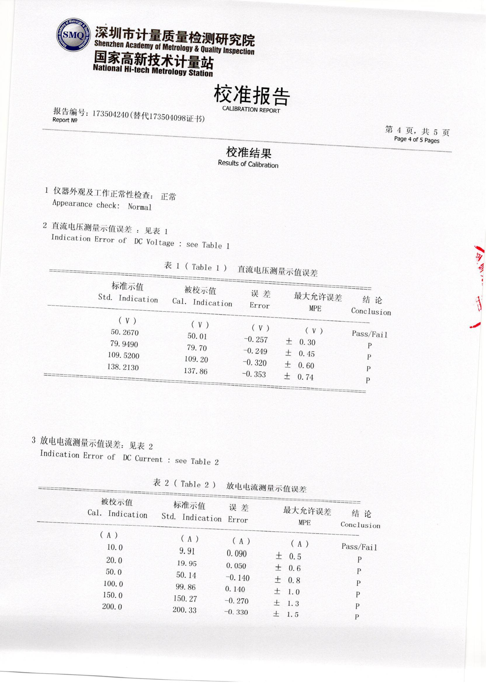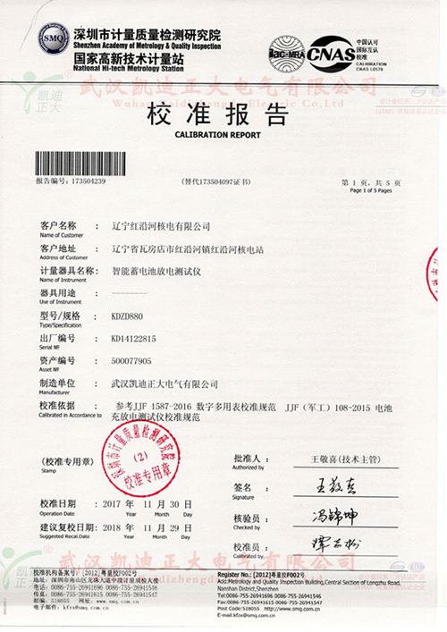 應中廣核遼寧紅沿河核電有限公司的需求,將武漢凱迪正大電氣公司生產的KDZD880(110V80A)智能蓄電池放電儀出具國家高新技術研究院的計量報告后才能使用。校準報告:173504097證書號,出廠編號:KD14122815,資產編號:500077905,校準依據:參考JJF158-2016數字多用表校準規范JJF(軍工)108-2015電池充放電測試儀校準規范。嚴格出具檢定合格報告。