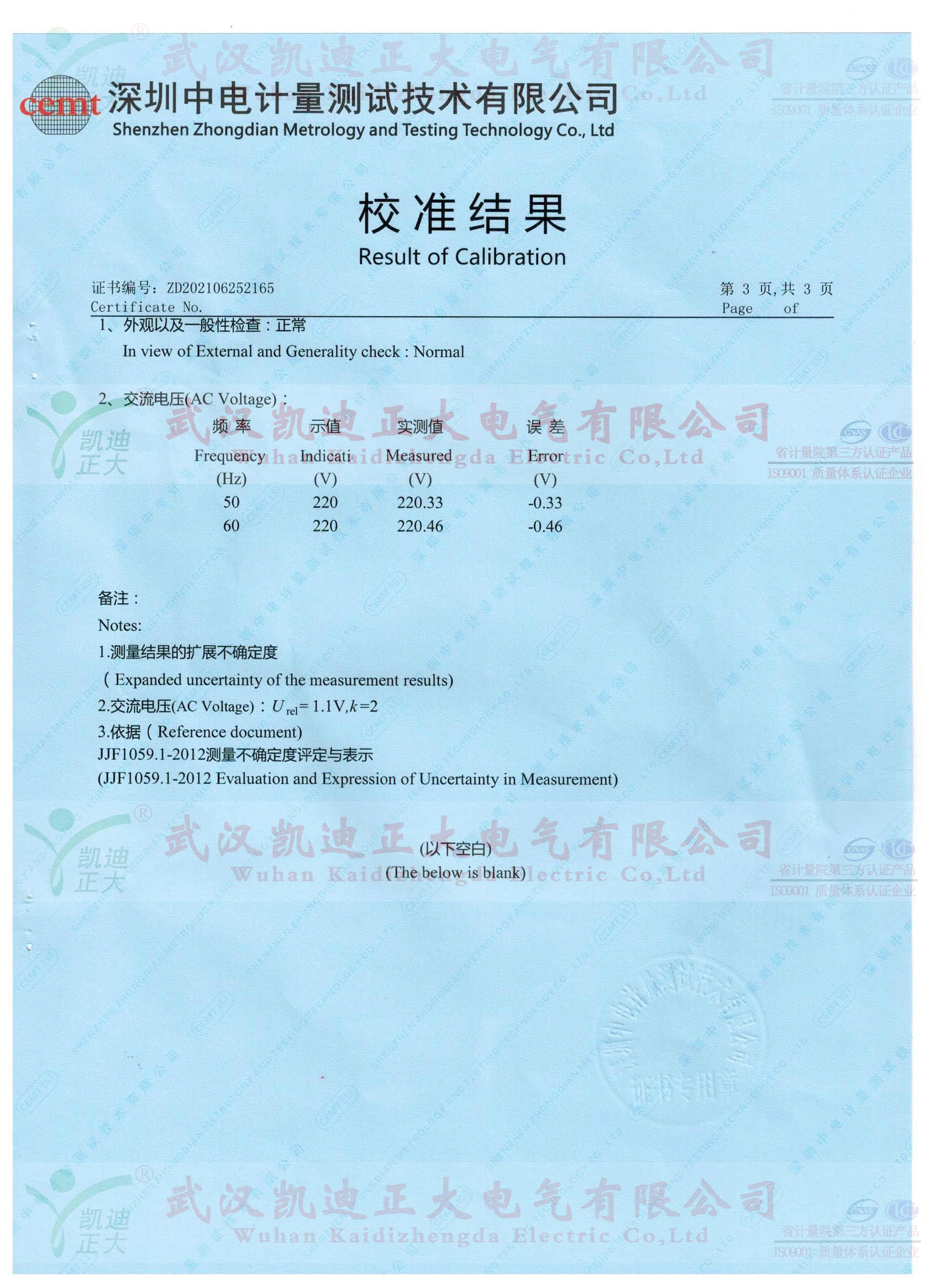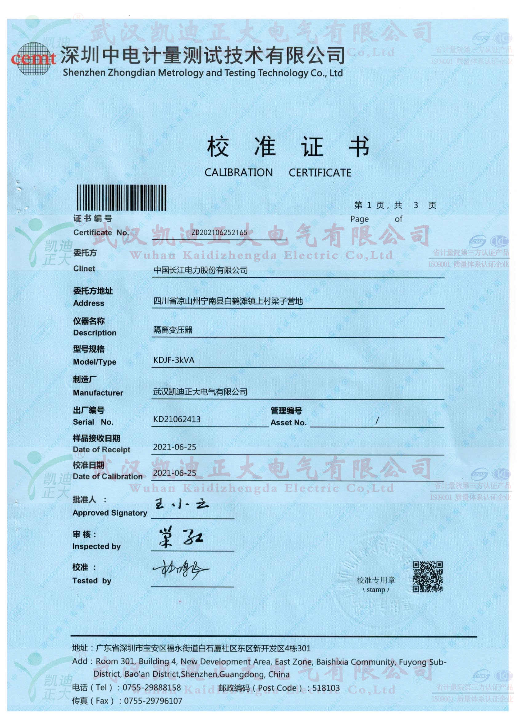 長江電力這次購買的隔離變壓器KD-JF3KVA獲得了中電計量的校準證書,證書號:ZD202106252165委托方:中國長江電力股份有限公司,地址:四川省涼山州寧南縣白鶴灘鎮上村梁子營地。隔離變壓器主要用于互感器、電力變壓器、高壓斷路器、耦合電容器、電容套管、開關等試品進行工頻耐壓、局部放電及其他科學試驗研究。KDQJF-30kVA/100kV無局放SF6工頻耐壓試驗裝置采用充氣式無局放試驗變壓器做為高壓電源,經過KD-JF3KVA隔離濾波裝置,取得50Hz正弦波為純凈局放量≤2PC的高壓電源,波形失真≤5%然后經無局放耦合電容器取得高壓電路中的脈沖信號經局放儀檢測被試品的局放量。本套設備參照GB/T16927.1高電壓試驗技術第一部分一般試驗要求;DL/T 848.3高壓試驗裝置通用技術條件 第3部分:無局放試驗變壓器等相關標準。
