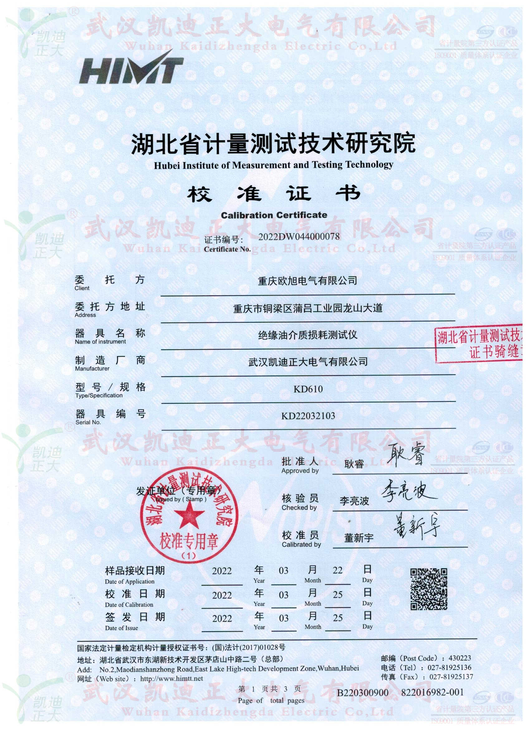 面對市場的優劣淘汰趨勢,國網電力公司、南網等各電力企業對高標準的節能變壓器有強烈需求。出廠檢測設備是歐旭公司申請資質需要的設備,在國內優質變壓器檢測設備公司對比后,選擇我司KDJJC-80變壓器油耐壓測試儀、KD610絕緣油介質損耗測試儀、KDJF-202無局放耐壓試驗裝置(10kVA/100kV)、KDZR-10A直流電阻測試儀等試驗設備。驗收標準已湖北省計量測試技術研究院校準證書合格報告為基準,省計量院是政府計量行政管理部門依法設立的國家法定計量檢定機構。校準器溯源國家高電壓計量站(計)字第2021042100號。