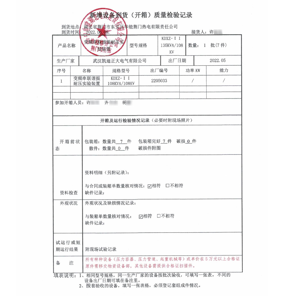 2022年6月初,華能荊門熱電有限公司采購凱迪正大電氣一批熱電廠電氣試驗設備,其中KDXZ-135kvA/108kV變頻串聯(lián)諧振耐壓試驗裝置已經(jīng)順利到貨,實發(fā)數(shù)量7件,實收數(shù)量7件。由中國電建湖北運維檢修公司荊門項目部許工負責驗收,火紅的電抗器顏色格外顯眼。許工和齊工一起對設備進行清點,仔細對比了湖北省計量院出具的計量檢測報告,對比現(xiàn)場升壓試驗精度,表示認可滿意。