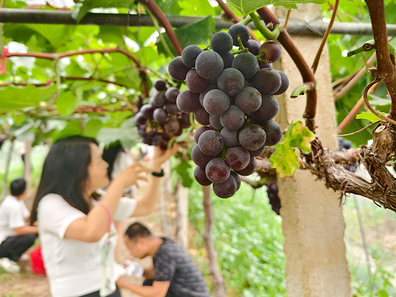 聚餐結(jié)束后還有采摘葡萄活動(dòng)等待著大家,雖然夏日的陽(yáng)光炙熱但大家的熱情卻絲毫未減。在雷總的帶領(lǐng)下大家手持籃筐,滿懷期待地踏入了郁郁蔥蔥的葡萄園。
