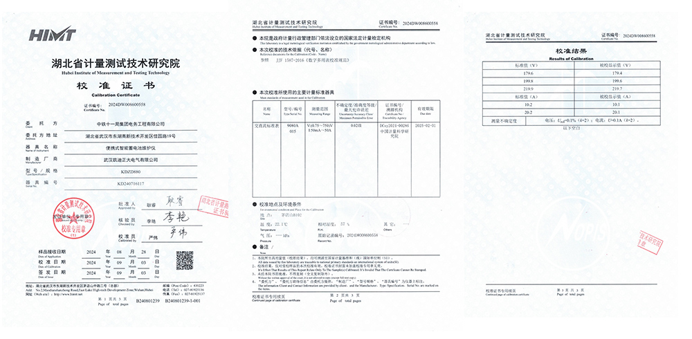 KDZD880便攜式智能蓄電池維護儀在交付前,順利通過了湖北省計量測試技術(shù)研究院的嚴格檢測。此次檢測嚴格遵循JJF 1587-2016《數(shù)字多用表校準規(guī)范》,對設(shè)備的測量精度、穩(wěn)定性、安全性等關(guān)鍵指標進行了全面評估。結(jié)果顯示KDZD880的各項性能指標均達到標準要求,為用戶的信賴與選擇提供了堅實的數(shù)據(jù)支撐。