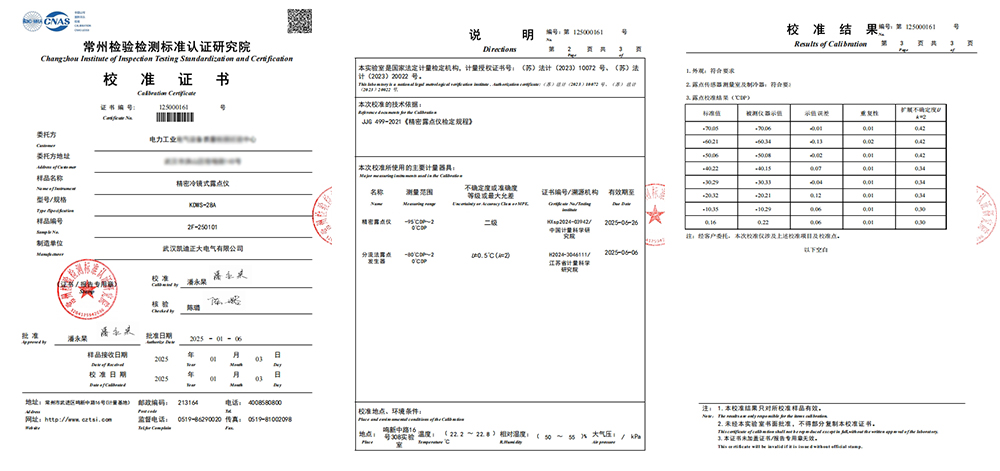 2025年1月3日,武漢凱迪正大電氣有限公司的KDWS-28A精密冷鏡式露點(diǎn)儀,成功通過了常州檢驗(yàn)檢測標(biāo)準(zhǔn)認(rèn)證研究院的嚴(yán)格校準(zhǔn),并榮獲校準(zhǔn)證書,標(biāo)志著該產(chǎn)品在工業(yè)氣體微水測量的可靠和精準(zhǔn)性。