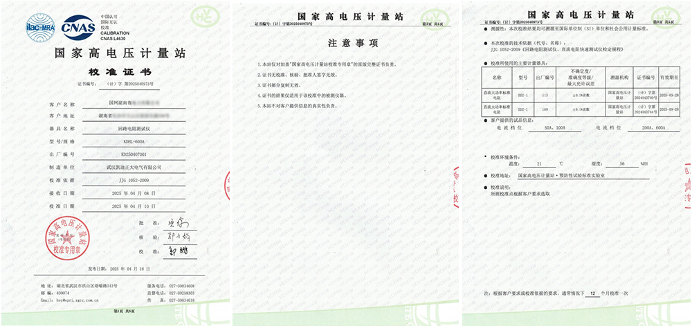 近日,國(guó)網(wǎng)湖南省某有限公司采購(gòu)的武漢凱迪正大KDHL-600A回路電阻測(cè)試儀,順利通過(guò)了國(guó)家高電壓計(jì)量站的嚴(yán)格校準(zhǔn),并獲得了校準(zhǔn)證書(shū)。